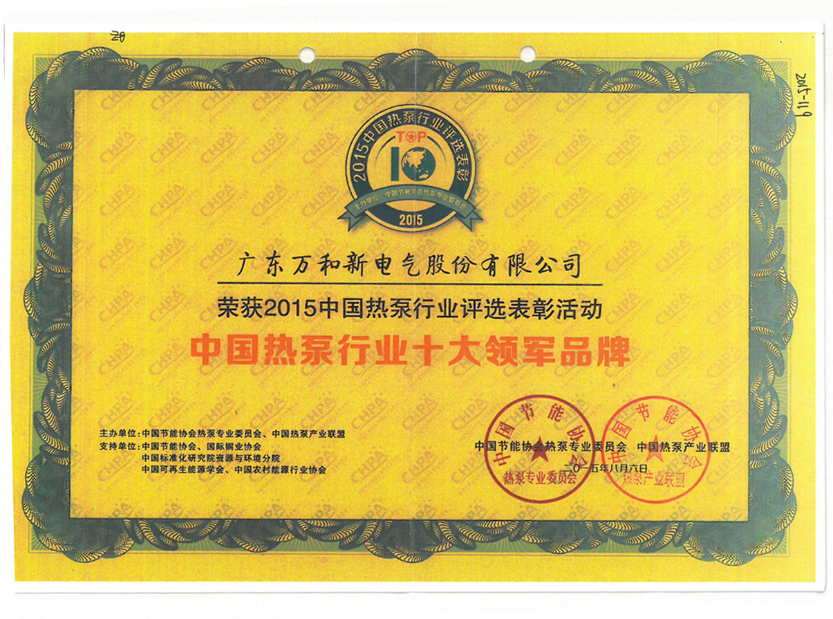 中國熱泵行業(yè)十大領(lǐng)軍品牌證書