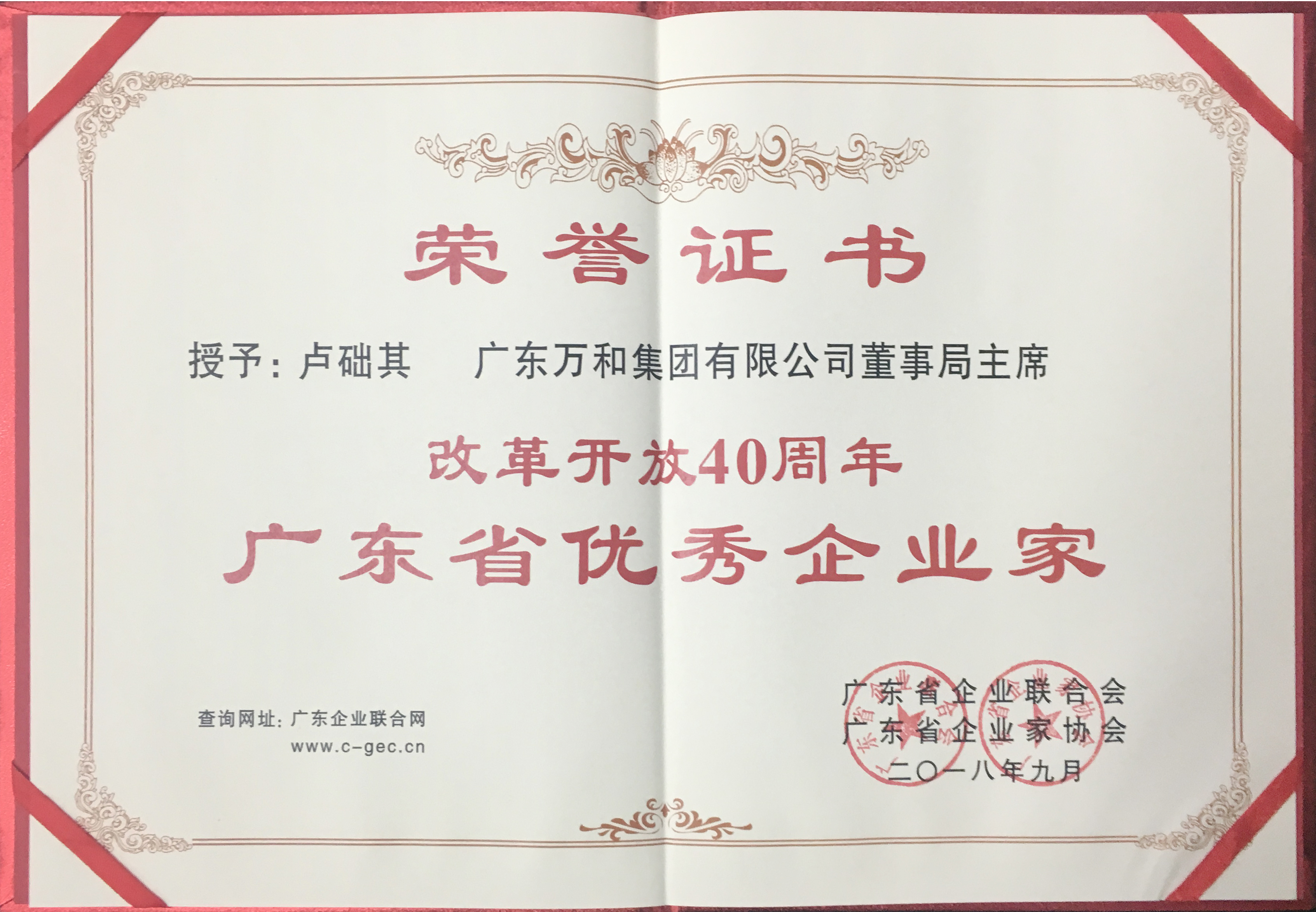 9月26日,由廣東省企業(yè)聯(lián)合會(huì)、廣東省企業(yè)家協(xié)會(huì)主辦的主題為“時(shí)代榜樣 不忘初心再出發(fā)”第24屆廣東省企業(yè)家活動(dòng)日大會(huì)在廣州隆重舉行。許家印、董明珠、李東生以及萬(wàn)和企業(yè)集團(tuán)董事局主席盧礎(chǔ)其等數(shù)十名知名企業(yè)家在本次活動(dòng)上榮膺改革開(kāi)放40周年“廣東省優(yōu)秀企業(yè)家”,廣東省委書(shū)記李希接見(jiàn)了優(yōu)秀企業(yè)、優(yōu)秀企業(yè)家代表,省長(zhǎng)馬興瑞出席會(huì)議并講話(huà)。