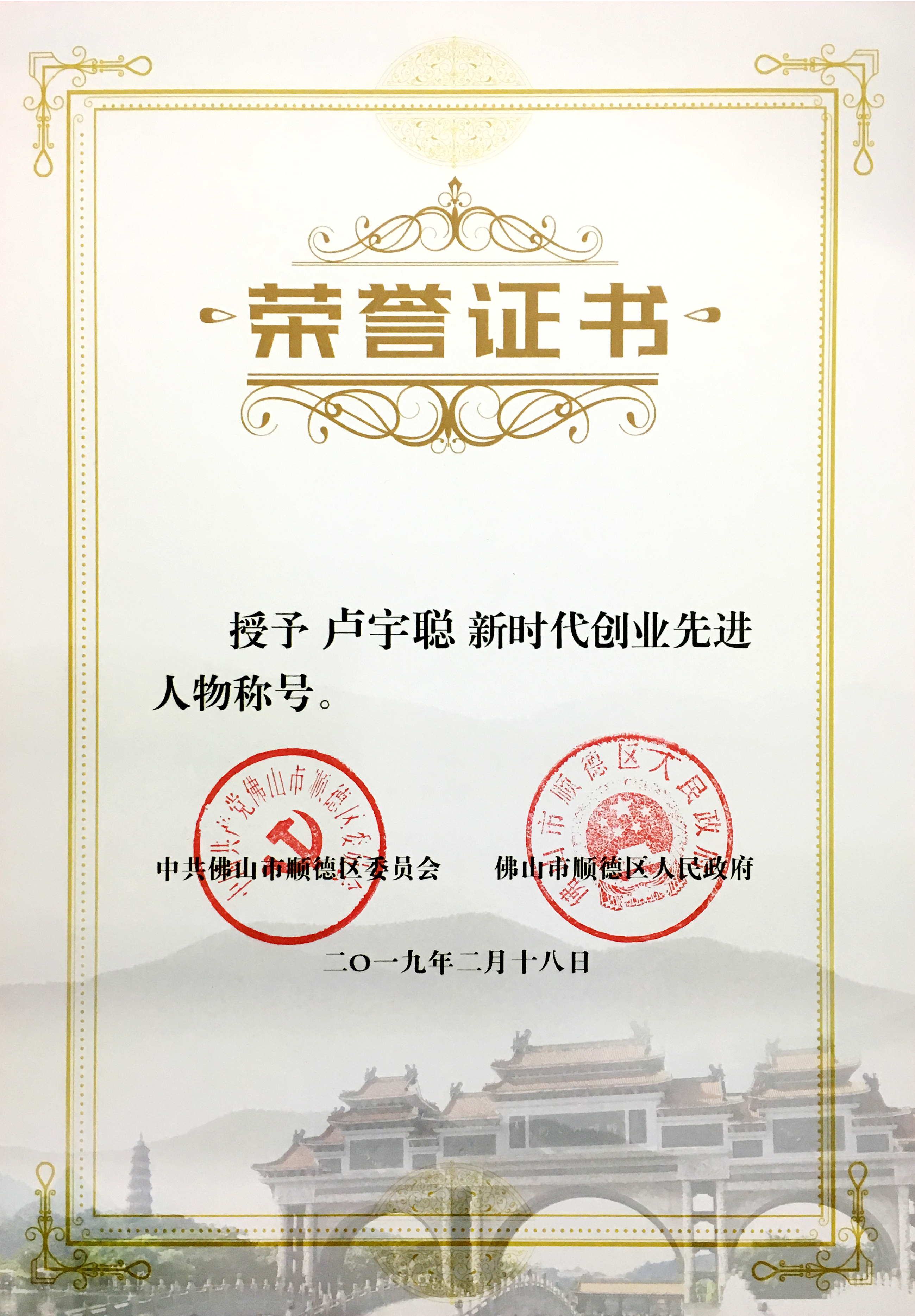 總裁盧宇聰榮膺順德區(qū)“新時(shí)代創(chuàng)業(yè)先進(jìn)人物”
