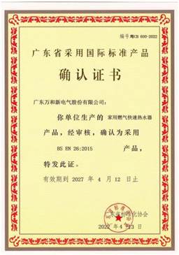 除了將滿足歐盟標(biāo)準(zhǔn)的燃?xì)鉄崴魃鲜袣W盟市場(chǎng)之外,萬和還將高標(biāo)準(zhǔn)的技術(shù)要求應(yīng)用到了在國(guó)內(nèi)銷售的燃?xì)鉄崴魃?。目前,萬和在國(guó)內(nèi)生產(chǎn)銷售的強(qiáng)排式直流風(fēng)機(jī)恒溫系列燃?xì)鉄崴?,不但滿足國(guó)標(biāo)GB6932-2015的要求,還按照歐盟燃?xì)鉄崴鳂?biāo)準(zhǔn)BS EN26:2015對(duì)產(chǎn)品的部分性能進(jìn)行了進(jìn)一步的收嚴(yán)和提升,并獲得了由廣東省標(biāo)準(zhǔn)化協(xié)會(huì)頒發(fā)的《采用國(guó)際標(biāo)準(zhǔn)產(chǎn)品標(biāo)志證書》和《廣東省采用國(guó)際標(biāo)準(zhǔn)產(chǎn)品確認(rèn)證書》。