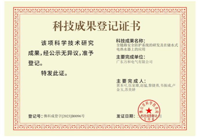“全鏈路安全防護(hù)系統(tǒng)的研發(fā)及在儲水式電熱水器上的應(yīng)用”項(xiàng)目,研發(fā)了漏電電壓檢測防護(hù)系統(tǒng)、新型安裝墻體絕緣結(jié)構(gòu)以及電加熱管底座連接新型絕緣結(jié)構(gòu)、全新APP智能化信息管理系統(tǒng),同時采用了II類機(jī)身結(jié)構(gòu)、雙重絕緣/加強(qiáng)絕緣的結(jié)構(gòu)、漏電電流檢測防護(hù)和出水?dāng)嚯姽δ艿榷囗?xiàng)防護(hù)措施,實(shí)現(xiàn)了電熱水器的全鏈路安全防護(hù)及智能管理。應(yīng)用該技術(shù)的產(chǎn)品能防止外部安裝環(huán)境的異常,以及防止產(chǎn)品機(jī)身外殼帶電而導(dǎo)致的危險,也可以對用戶家庭其它電器漏電、供電線路漏電、用戶家庭供水管路和墻體帶電情況進(jìn)行有效監(jiān)測,同時還能通過APP推送相關(guān)信息給用戶及萬和售后客服后臺,防止因用戶家庭用電環(huán)境出現(xiàn)異常而導(dǎo)致的可能存在的觸電風(fēng)險,進(jìn)一步提高了電熱水器的安全性能。近日,《全鏈路安全防護(hù)系統(tǒng)的研發(fā)及在儲水式電熱水器上的應(yīng)用》鑒定項(xiàng)目正式獲得科技成果登記證書。