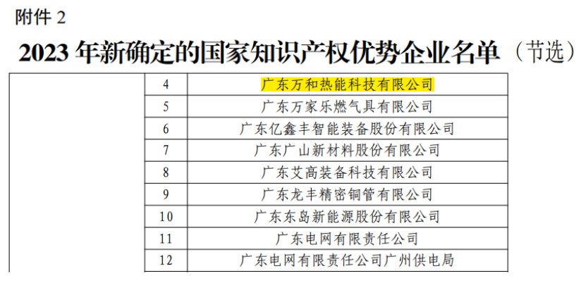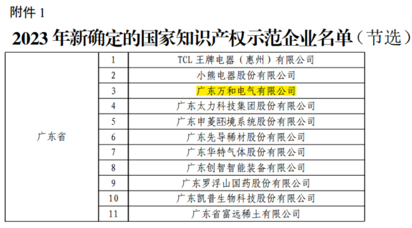 12月6日,國(guó)家知識(shí)產(chǎn)權(quán)局發(fā)布了“關(guān)于確定2023年新一批及通過(guò)復(fù)核的國(guó)家知識(shí)產(chǎn)權(quán)示范企業(yè)和優(yōu)勢(shì)企業(yè)的通知”,廣東萬(wàn)和新電氣股份有限公司旗下子公司廣東萬(wàn)和電氣有限公司首次獲評(píng)國(guó)家知識(shí)產(chǎn)權(quán)示范企業(yè),廣東萬(wàn)和熱能科技有限公司首次獲評(píng)國(guó)家知識(shí)產(chǎn)權(quán)優(yōu)勢(shì)企業(yè)。