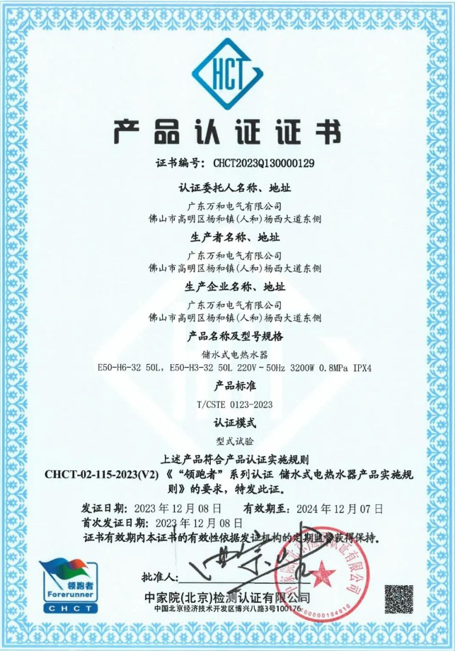 最近,中家院(北京)檢測(cè)認(rèn)證有限公司正式下發(fā)產(chǎn)品認(rèn)證證書(shū),認(rèn)定由廣東萬(wàn)和電氣有限公司(廣東萬(wàn)和新電氣股份有限公司子公司)生產(chǎn)的兩款電熱水器E50-H6-32和E50-H3-32雙雙通過(guò)“領(lǐng)跑者”系列認(rèn)證。