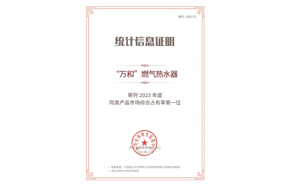 4月18日,由中國商業(yè)聯(lián)合會、中華全國商業(yè)信息中心聯(lián)合主辦 “2024中國消費品市場發(fā)展大會暨第三十二屆中國市場商品銷售統(tǒng)計結果發(fā)布會”在北京中國職工之家召開,根據對全國大型零售企業(yè)商品銷售調查統(tǒng)計結果,中華全國商業(yè)信息中心認定廣東萬和新電氣股份有限公司旗下的“萬和”燃氣熱水器榮列2023年度同類產品市場綜合占有率第一位,這已是“萬和”燃氣熱水器連續(xù)20年獲得此項桂冠。
