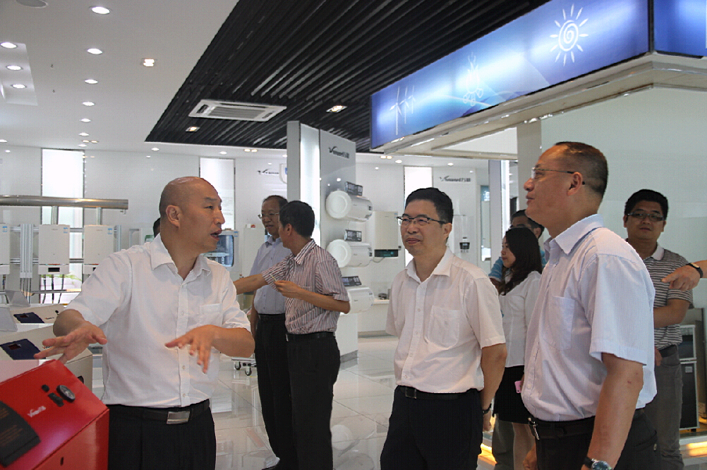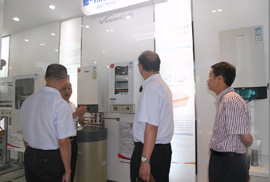 廣東省質(zhì)監(jiān)局調(diào)研組參觀萬和產(chǎn)品展廳,熱能科技拓展中心總經(jīng)理鐘家淞為調(diào)研組介紹萬和采暖熱水爐、商用鍋爐
