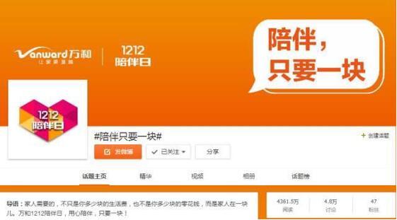 12月12日,由萬(wàn)和發(fā)起的#陪伴只要一塊#微博話題,引發(fā)千萬(wàn)人關(guān)注,眾多媒體、明星大V、社會(huì)各界人士紛紛轉(zhuǎn)發(fā)相關(guān)微博內(nèi)容,話題閱讀量高達(dá)4000余萬(wàn)。
