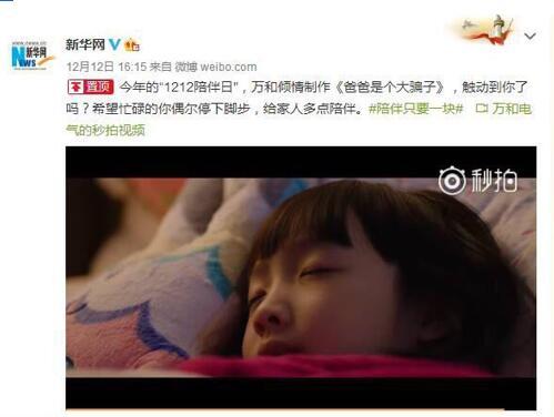 另外,此次傳播的主視頻《爸爸是個(gè)大騙子》,一經(jīng)上線,便在微信和微博上持續(xù)發(fā)酵,掀起了全民刷屏呼吁陪伴的高潮。截至12月12日24點(diǎn),全渠道視頻的累積播放量已經(jīng)突破500萬(wàn)人次。