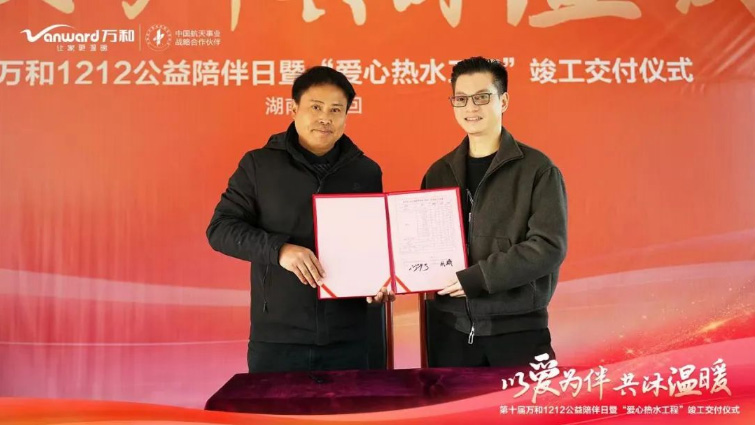 在隨后的交付儀式上,萬(wàn)和電氣董事長(zhǎng)盧宇聰與南岳廟九年義務(wù)制學(xué)校校長(zhǎng)周輝登臺(tái),在現(xiàn)場(chǎng)領(lǐng)導(dǎo)、來(lái)賓及現(xiàn)場(chǎng)師生的見(jiàn)證下簽下施工交付清單,宣布南岳廟九年義務(wù)制學(xué)校的“愛(ài)心熱水工程”正式交付使用。